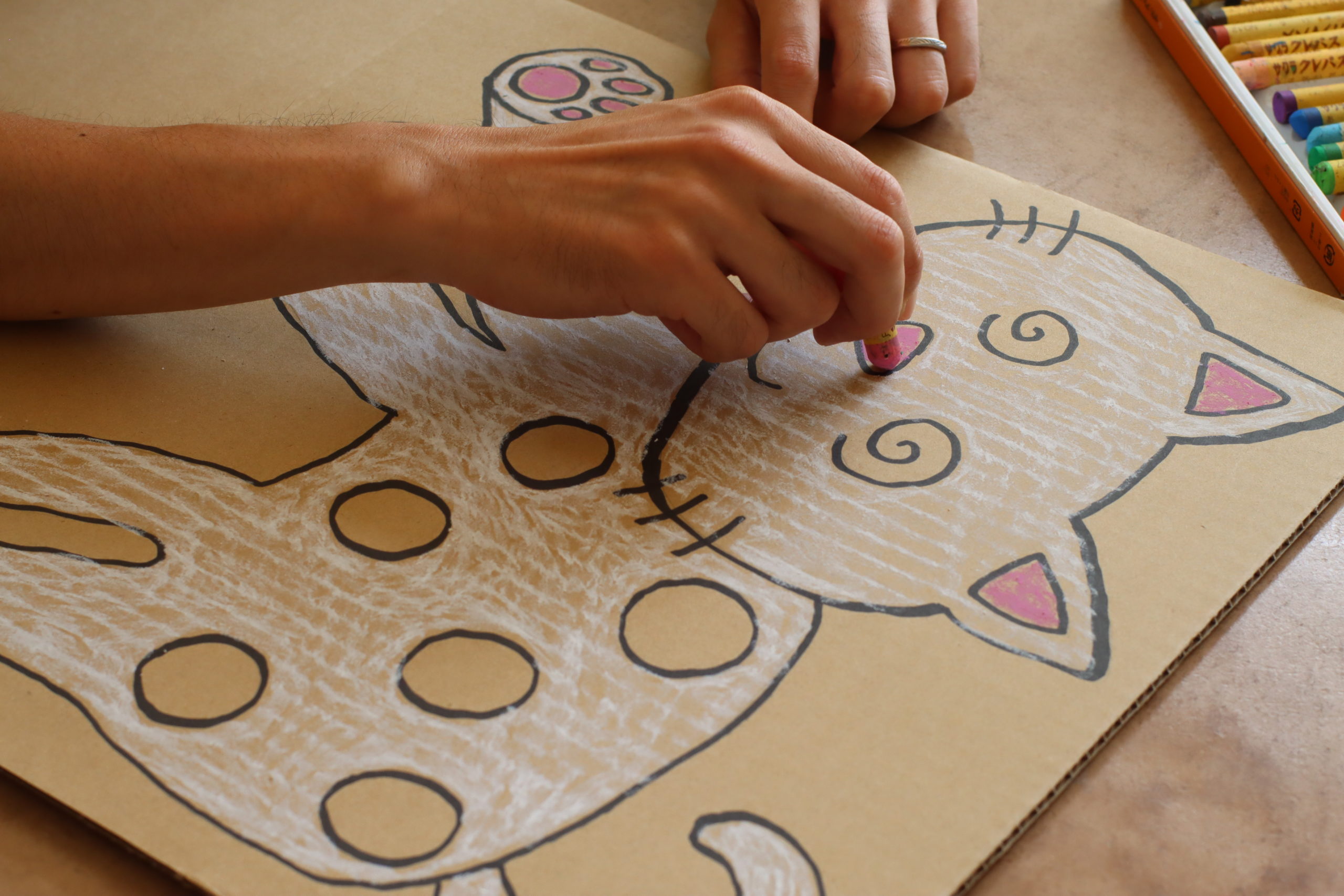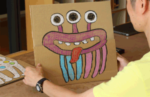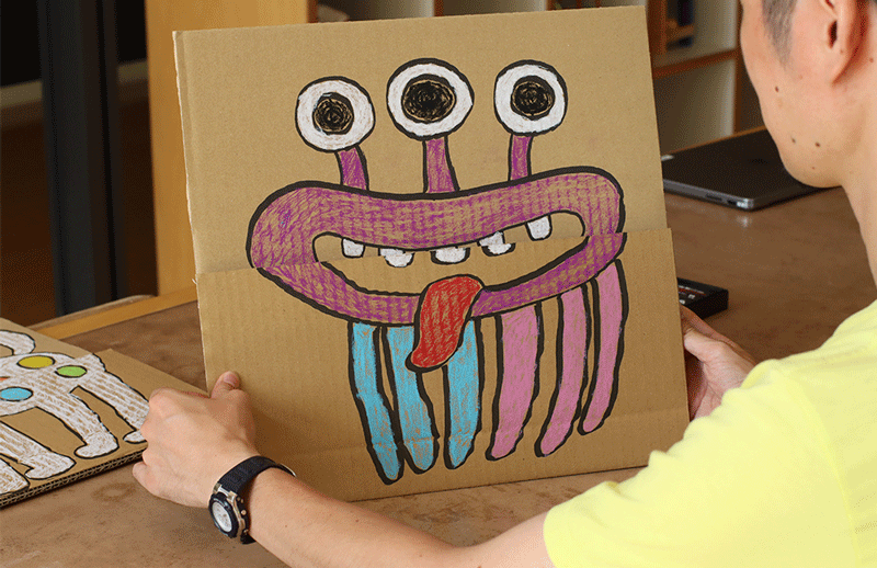 段ボールに2種類の絵を描いてコマ撮りアニメーションにします!自分だけのオリジナルペットといっしょにトコトコおさんぽしよう!