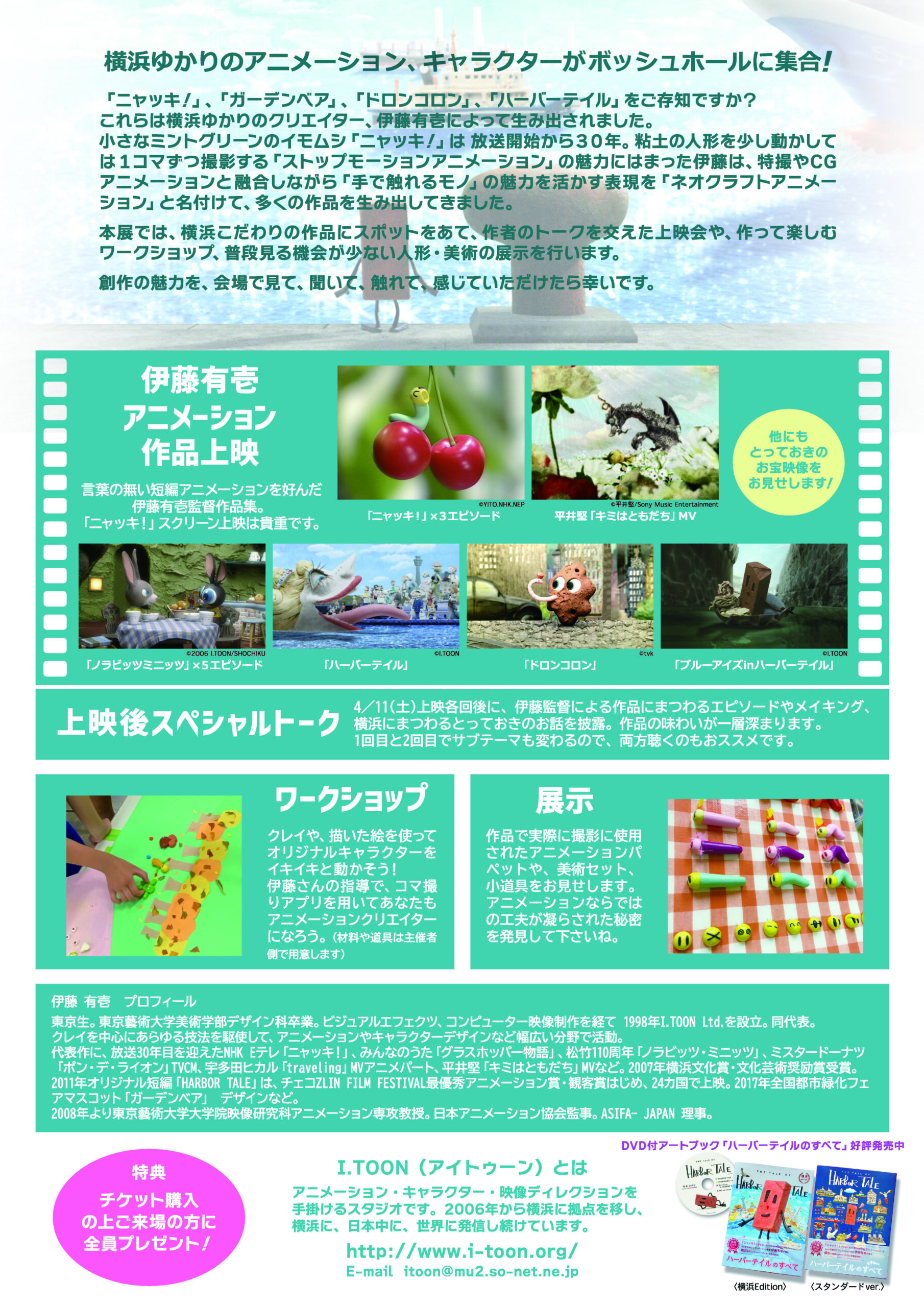 NHKプチプチ・アニメで30年続く『ニャッキ!』の生みの親、伊藤 有壱さん。この展示では『ニャッキ!』『ハーバーテイル』『ドロンコロン』『ノラビッツミニッツ』などが上映され、さらに絵コンテや当時の制作ファイルなども大量に展示されるそうなので、コマ撮りの制作に興味ある人ほど楽しめる展示会かもしれません!楽しみですね!